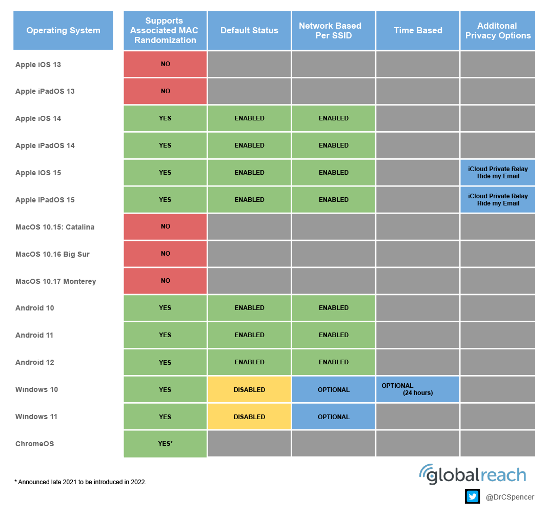 Fig. 1 below provides the status of MAC address randomisation implementation across the major operating systems in January 2022.